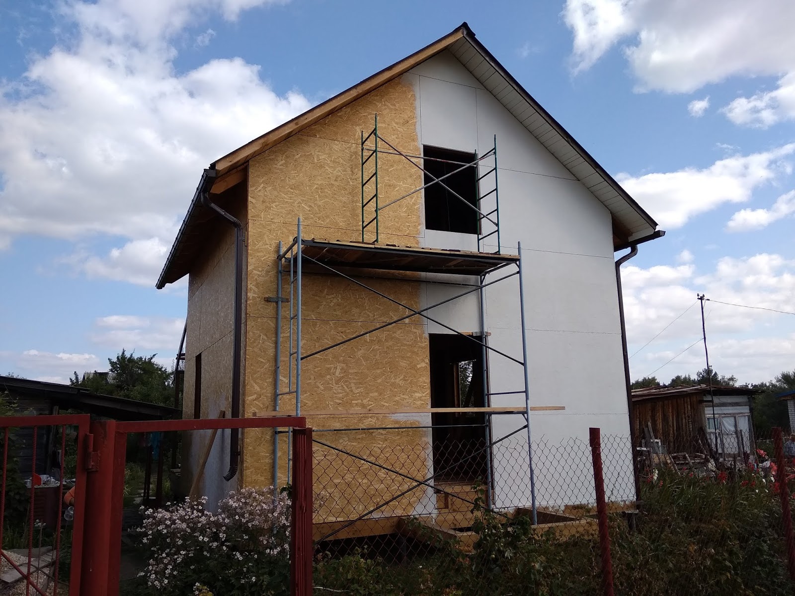 Таким образом, в мой график стройки вклинился пункт покраска ОСП. В общем, я решил в этом году покрыть грунт-краской весь фасад, а в следующем сделать декоративные планки на швы.